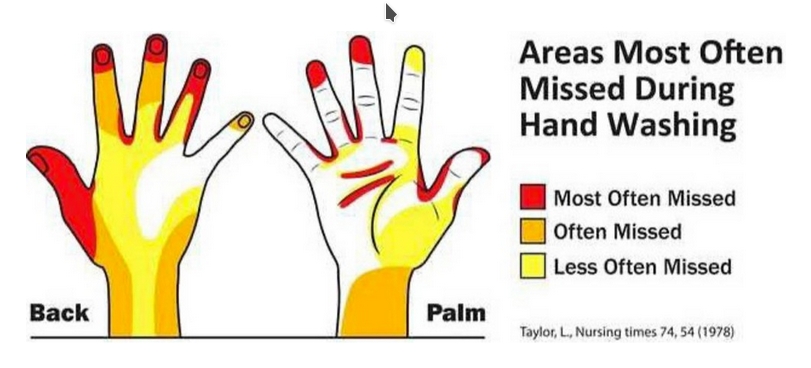 Do you know how to wash your hands properly? Most people do not even if they think they do. That’s because it’s easy to miss areas of the hands with normal hand washing, and most are unaware of the techniques involved to ensure cleanliness. Figure 1 reveals which areas of the hands are most frequently missed when washing. In particular, the thumbs, the tips and backs of the fingers and the wrists are often neglected.