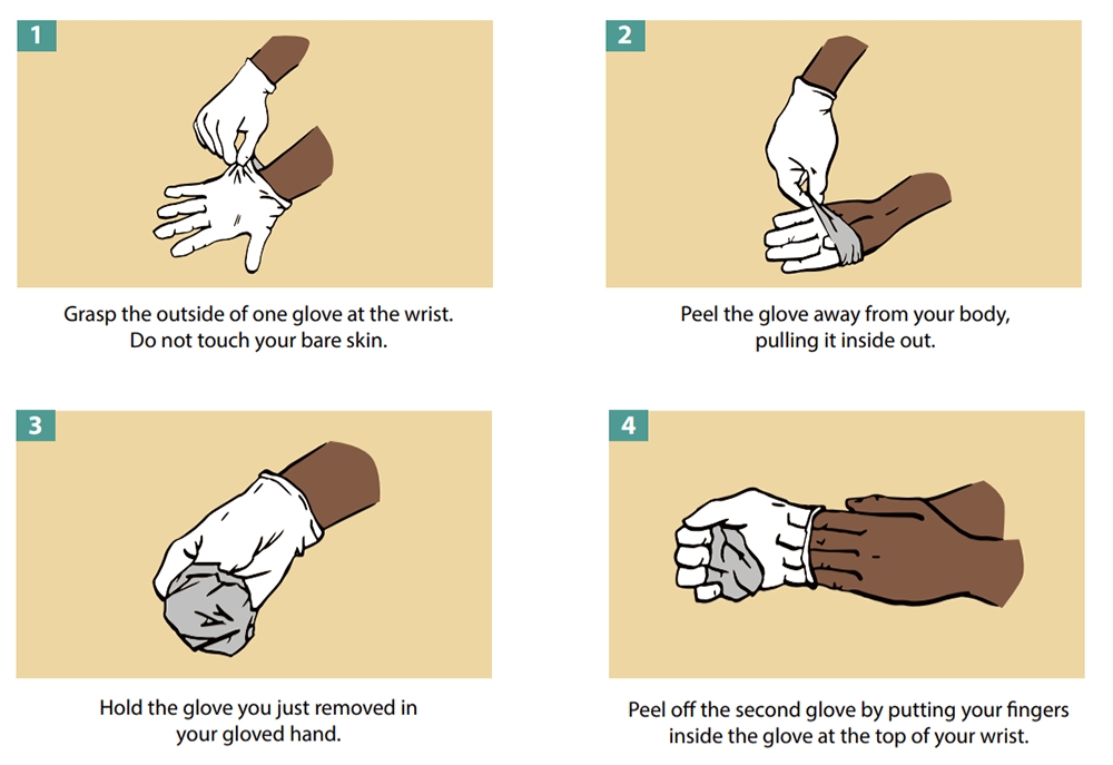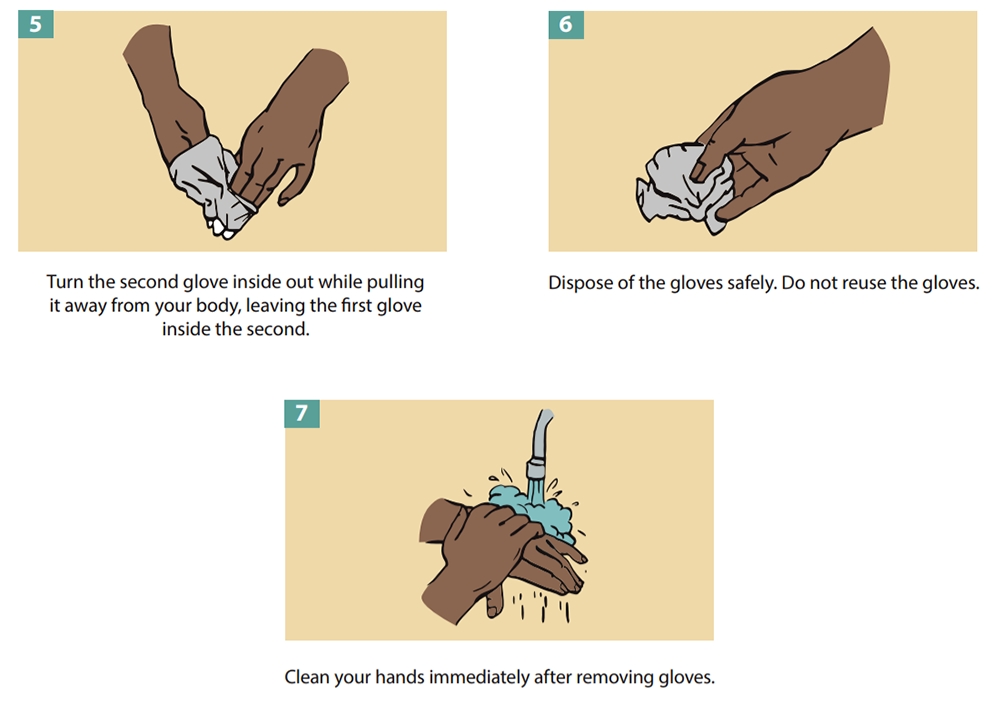 *Guidelines from the US Centre Disease Control (www.cdc.gov/vhf/ebola/pdf/poster-how-to-remove-gloves.pdf). Research shows that improper removal of gloves increase the risk of accidental infection(15).