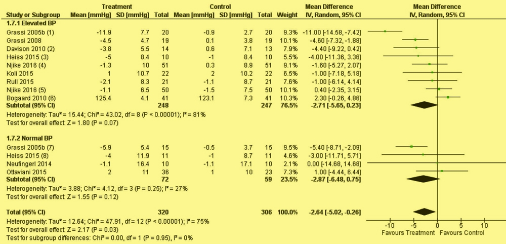 Each black diamond shows the overall effect of cocoa consumption. On the scale bottom right, zero = no benefit; a negative number shows a drop in blood pressure. This drop was evident regardless of whether subjects had high or normal blood pressure at baseline.