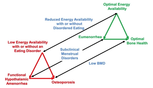 Rather than an ‘either/or’ condition, the female triad can be considered as spectrum from optimum eating, hormonal function and bone health (green) to poor eating/eating disorder, amenorrhea and osteoporosis at the other end (red). The further towards the red end of the spectrum, the greater the risk of a stress fracture.