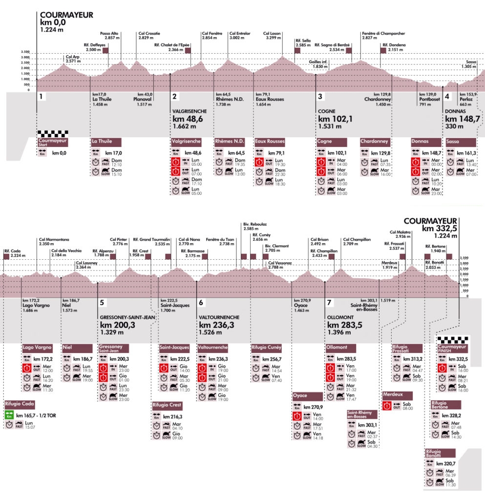 Much research exists as to how the body adapts to these ups and downs. Researchers looked at the effects that the Tor des Géants (one of the world’s toughest mountain ultras – see figure 2) had on the performance of runners over varied terrain (level and uphill)Eur J Appl Physiol. 2014 May;114(5):929-39. The runners were tested before and after the Tor des Géants and it was discovered that they adapted their uphill gait by increasing contact time during each footfall, and a decrease in leg swing going into the next stride. These are not that surprising outcomes given the need to conserve energy in such events. Highly relevant was the fact that the runners’ energy cost for running uphill decreased by 13.8% by the end of the event.