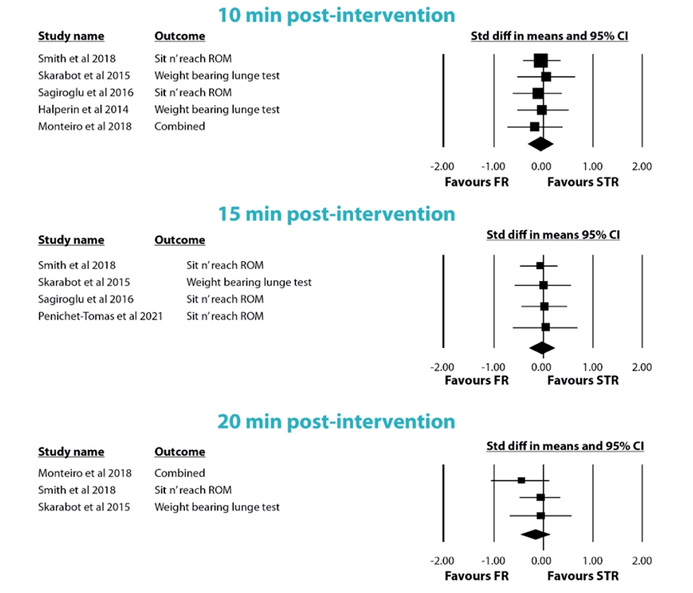 As the researchers were mostly interested in the short-term impact of these interventions, they were analyzed the range of motion outcomes at 0, 10, 15, and 20-minutes after either foam rolling or stretching. Considering our interest in using stretching and foam rolling to acutely improve range of motion (ie in the period immediately after rolling/stretching), the researchers in this study asked the perfect question – allowing them to see the impact of both options on short-term changes in range of motion.