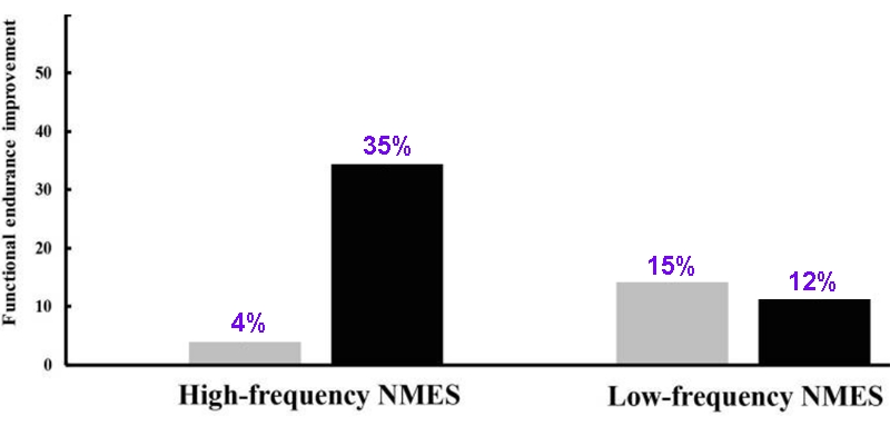 Percent improvements in functional endurance after high- and low-frequency neuromuscular electrical stimulation (NMES) interventions in healthy subjects (gray histograms) and patient populations (black histograms).
