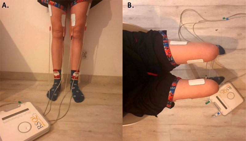 Placement of electrodes of the thigh and the RSQ1 device: (A) front view and (B) from above view.