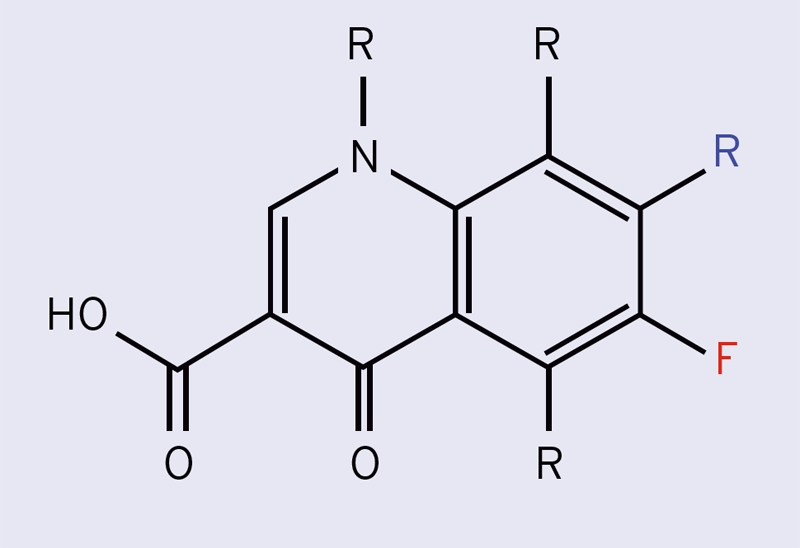 NB: ‘F’ represents the fluorine atom common to all fluoroquinolones while the blue ‘R’ group is the side chain of atoms determining the exact type of antibiotic that results.