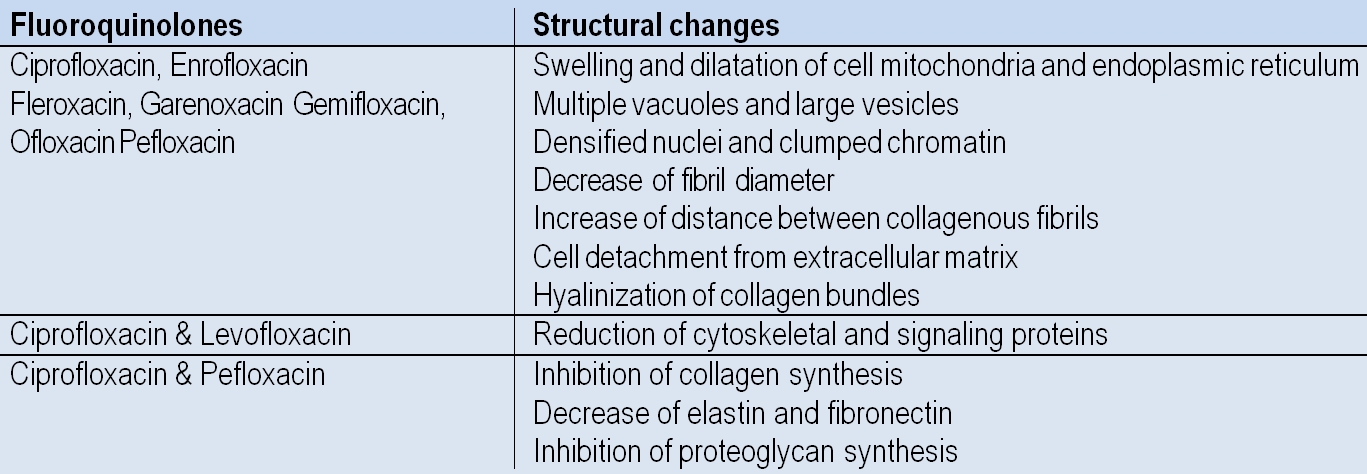 Table 1: Structural and biochemical changes in tendon cells induced by fluoroquinolones(1-6)
