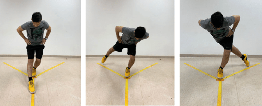 He/she reaches as far as possible with the other leg, lightly touching in each of the three directions of the Y shape along the lines that form the Y mark. These directions are (see figure 1):