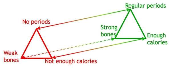 However, in 2007, the ACSM tweaked this definition to explore the relationship between not only DE, but overall energy availability (EA), menstruation, and bone status. This adjustment to the definition reflected the fact that both disordered eating (anorexia, bulimia, etc.) and over activity contribute to energy deficit. In other words, reducing input or increasing output brings the same end - ie a shortage of calories. This added clarity allowed sports professionals to classify athletes along a spectrum of health ranging from sufficient EA, normal menses, and solid bones, to low EA, abnormal to non-existent menstrual cycles, and osteopenia or osteoporosis(see figure 1).