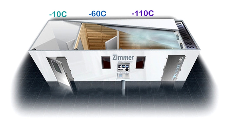 see figure 2). To cool the air in the rooms, refrigerants, such as liquid nitrogen, flow through pipes located inside the walls, or compressor units act as super air conditioners. The subjects never come in direct contact with the cooling agent. The rooms hold two or more people who also wear minimal clothing but must don coverings to feet, hands, mouth/nose, and ears. The antechambers allow acclimatisation to the cold and individuals spend at least 30 seconds in the outer room (usually cooled to -60° C) before entering the main compartment where the air temperature drops to -110°C to -140°C for two to four minutes.