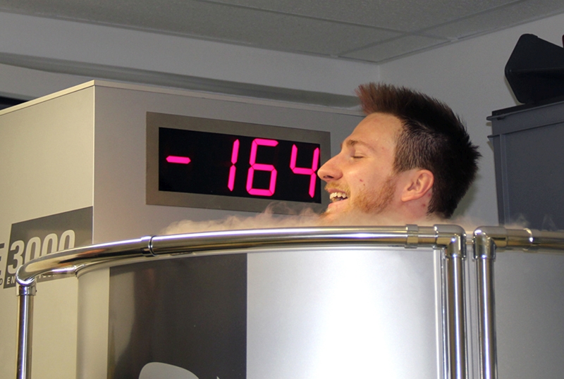 Doctoral candidate Erich Hohenauer monitors a study subject in a partial-body cryotherapy chamber(1) (used with permission).