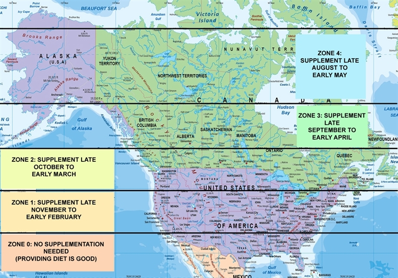 Zones show when and where the UVB content of sunshine is too low (below 1000W/m2) to synthesize meaningful amounts of vitamin D in skin - and therefore when supplementation of vitamin D (1000-2000IUs per day) is recommended(17). Athletes should still ensure their diet contains plenty of vitamin D rich foods at all times though!