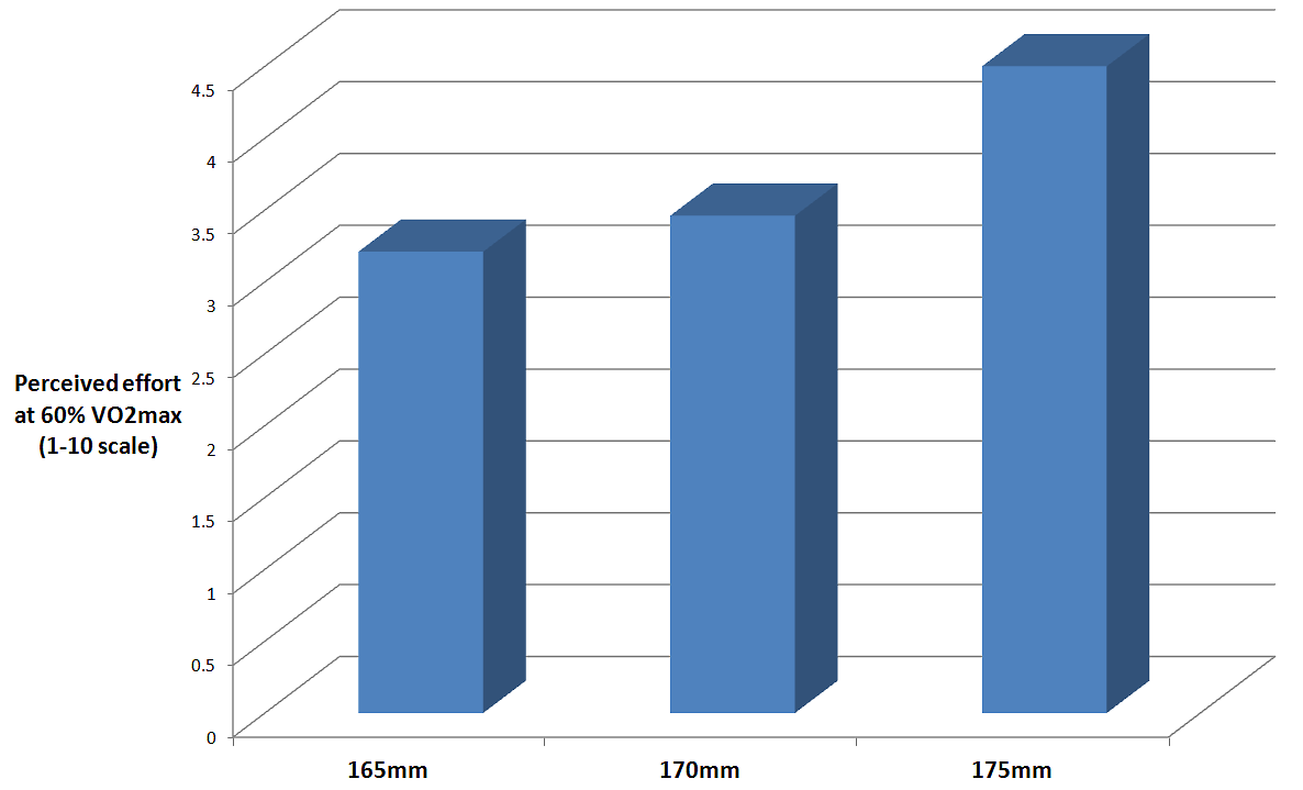 Twenty eight fit male road cyclists were recruited, all over 25 years old with at least four years of racing experience. Participants had high levels of fitness with a maximum oxygen uptake (VO2max) averaging 59mls/kg/min, and peak power at VO2max averaging 5.15 Watts per kilo of body weight – placing them firmly in the ‘elite amateur’ category. Each rider performed three separate cycling trials using the three different crank lengths. Each test was separated by 72 hours to ensure full recovery and the order of the tests (ie whether using the 165, 170 or 175mm crank lengths) was randomized. Moreover, the test were blinded as far as possible, which meant the cyclists were not told about the different crank lengths used for each trial – indeed they were told the bike set up was the same each time around. It’s true that some riders might have guessed the crank length changes from ‘feel’ of the pedalling action, but that was factored into the researchers’ conclusions. In all three tests, the saddle position, handlebar position, and fore-aft adjustments etc stayed constant, optimized for each person’s height and build.