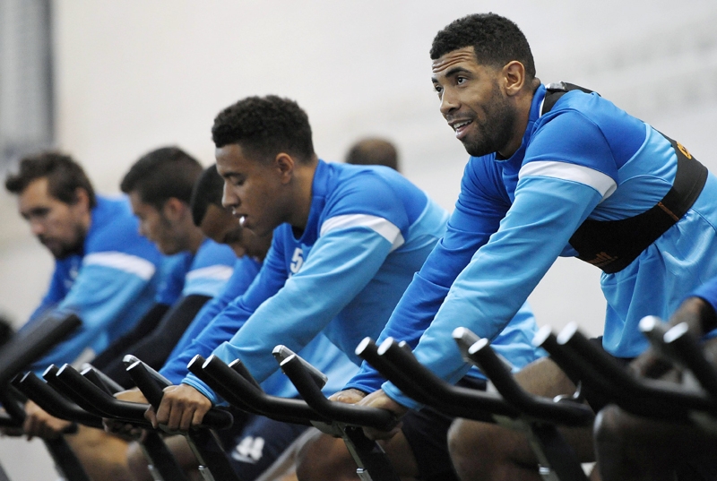 Blackburn Rovers soccer team undergoing an interval training session at the Blackburn Rovers Training Ground.