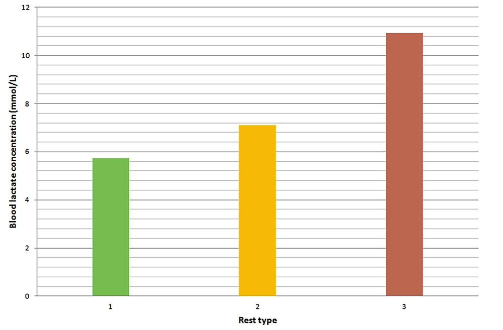Blood concentration of lactate after 10 minutes of differing rest type: 1= active rest; 2 = passive plus massage; 3 = pure passive rest.