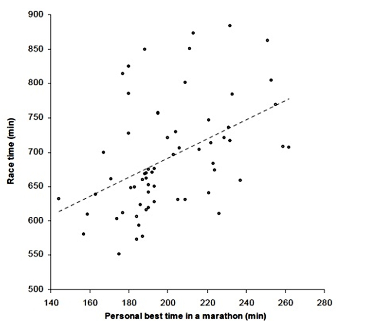Eg, using the best fit line, a 3-hour marathon PB predicts a 670-minute Ironman