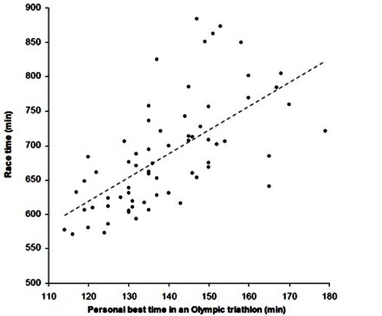 Ironman time prediction (in minutes) = 186.3 + 1.595 × (PB for Olympic distance triathlon) + 1.318 × (PB for marathon)