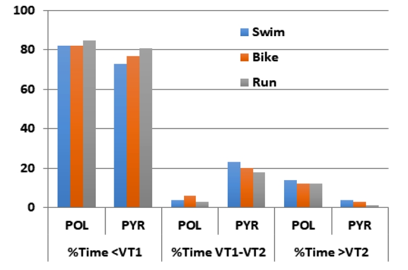 The key finding was that no significant differences were observed between the polarized and pyramidal race times, and both training distributions showed produced significant fitness gains in the triathletes – in all three disciplines. In fact, the pyramidal group showed a statistically significant improvement in maximum running speed at VT2 (lactate threshold) and the maximum aerobic speed - gains that led the pyramidal group to turn in slighter faster times in the Half-Ironman race - whereas the polarized group did NOT experience these gains. In short, this research showed that although the ‘polarized is best’ mantra might be correct for elite athletes, the same is not necessarily true for recreational/amateur athletes.