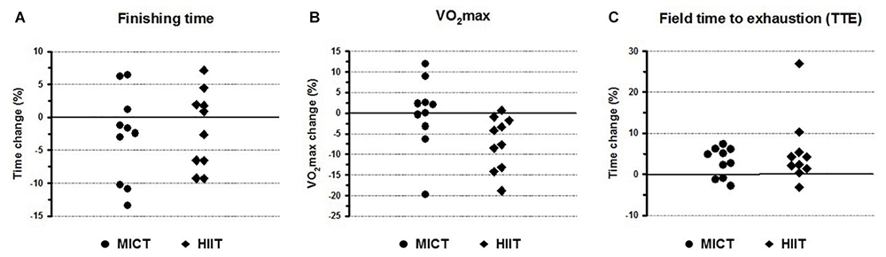 - The HIIT group showed a smaller reduction finishing times of 1.8% on average, which meant that it took them 2 minutes 34 seconds less to complete the half-marathon compared to their previous finishing times. However, this group was more much more polarised in terms of responses; five subjects were responders, with an average time reductions of 7 minutes 54 seconds compared to the mean of their previous finishing times, while the other five were non-responders, increasing their mean previous finishing time by 3 minutes 37 seconds (see figure 1A).