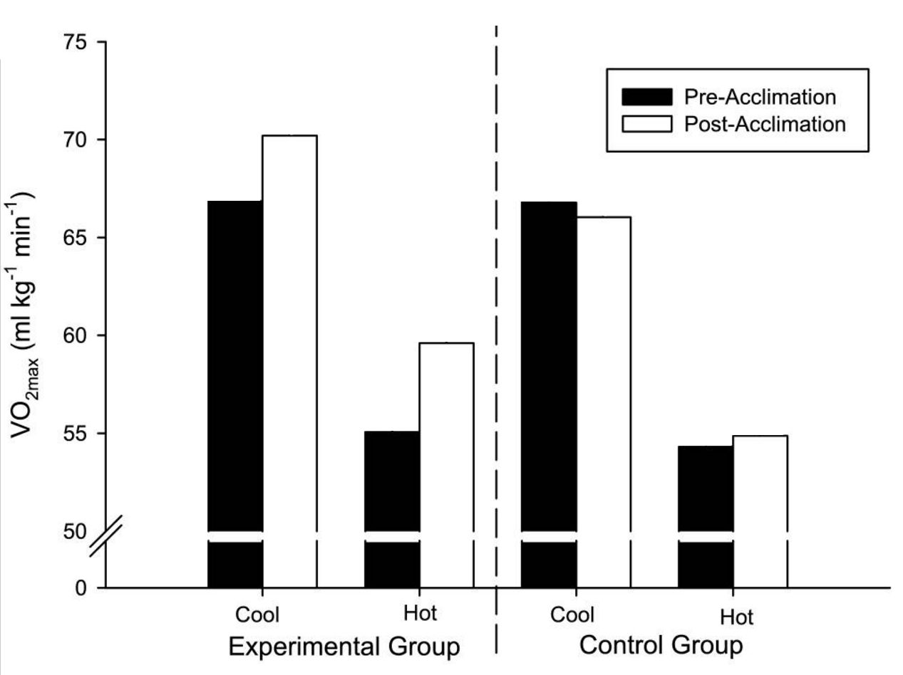 The first inkling this might be the case came from a study by researchers from the University of Oregon, published in 2010 in the Journal of Applied Physiology(6). A dozen experienced cyclists worked out for 100 minutes a day for ten days on stationary bicycles in a very hot room (40°C, 50% relative humidity). At the end of this training regime, their average maximum aerobic power measures (VO2max – a prime measure of endurance performance) under cool conditions had jumped by 5 percent compared to a control group who continued training in normal heat (see figure 2), and their time-trial performances in both hot and cool conditions had jumped by 6-8 percent!