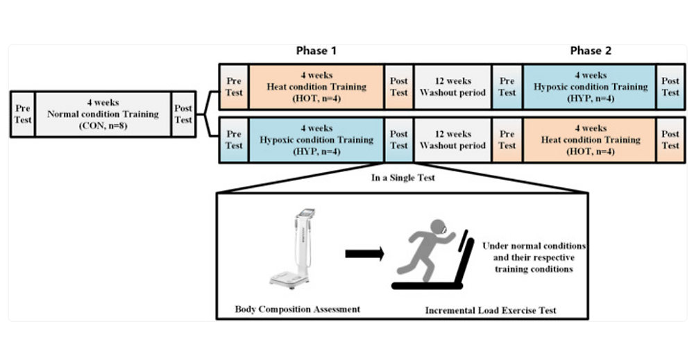Eight elite modern pentathlon athletes initially underwent a 4‐week training period under normal conditions following their normal training program using neither altitude nor heat. During this period, the athletes underwent baseline body composition and VO2max (aerobic capacity) assessments using an incremental load test on a treadmill to exhaustion. Following the control phase, the athletes were randomly assigned to one of two groups:
