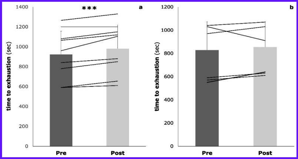 HIIT group shown on left (a); control group shown on right (b). Significant gains in time to exhaustion were seen only in the HIIT group.