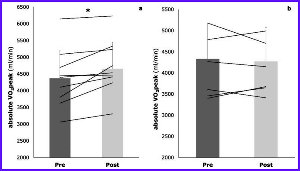 Significant gains in absolute oxygen uptake were only seen in the HIIT-trained rowers (a) shown on the left hand graph.
