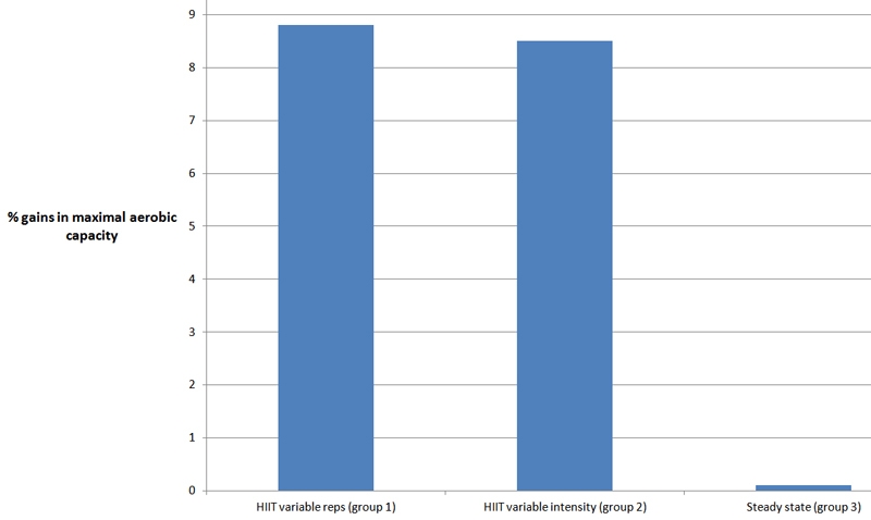The key finding was that both HIIT groups experienced major gains in maximum aerobic capacity whereas the steady state group experienced no gains (see figure 1). The HIIT groups also experience gains in anaerobic performance and more favourable hormonal profiles, indicating less metabolic stress than the groups performing steady state training. Importantly, these benefits were seen regardless of the number of HIIT intervals or interval intensity, which suggests that the exact combination of intensity/duration/number of intervals is rather less important than actually doing some HIIT in the first place!