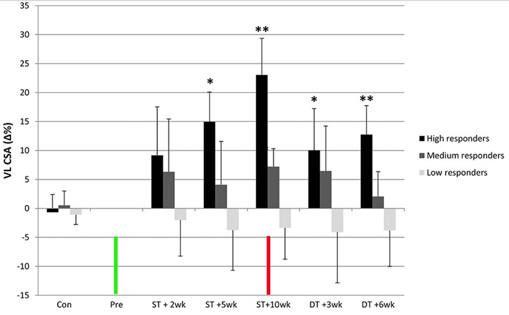 Relative changes (mean and SD) in muscle CSA in high, medium and low responders after 2, 5, and 10 weeks of strength training and 3 and 6 weeks of detraining. Con refers to the control measurements before training commenced. Geen bar = start of training; red bar = end of training and start of detraining. * means that the results were significantly different compared to the corresponding pre-training value; ** means that the results were very significantly different (p less than 0.01). VLCSA = vastus lateralis muscle cross-sectional area.