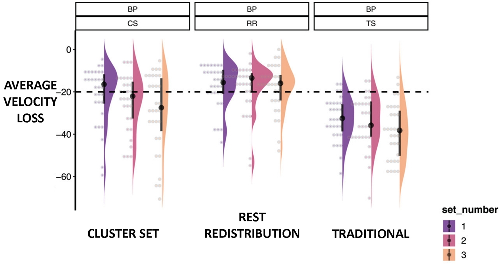 Data here shown for bench press. NB: BP = Bench press; CS = Cluster set structure; RR = Rest redistribution set structure; TS = traditional structure. The dashed line represents a 20% velocity loss threshold, below which is undesirable. Each dot represents one data point. The large black dots on the bold lines represent the average velocity loss across the set. The curves represent the distribution of the data. It can be seen clearly that the cluster set and (particularly) rest redistribution set allowed far more reps to be completed before velocity losses exceeded 20%.