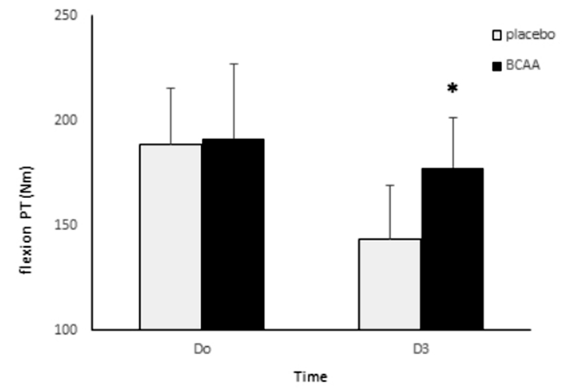 The BCAA group (dark bars) experienced no significant drop in peak hamstring torque – unlike the placebo group.