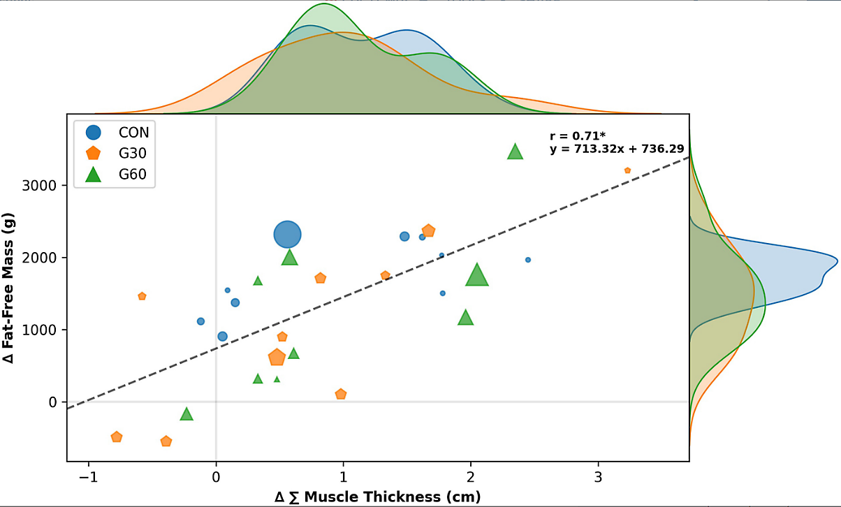 The subjects were tested for changes in muscle mass and muscular strength of the legs. To measure fat free mass, DEXA scans were performed. DEXA is an x-ray technology that is the gold standard for measuring the amount of tissue in the body, whether fat mass, fat free mass, or bone. This accurate technology was used to determine whether there changes in fat free mass of the thigh over the course of the intervention. Ultrasound was also used to determine the thickness of the thigh musculature. Measurements were taken at the proximal thigh, which is closest to the hip, and the distal thigh, which is closest to the knee. This provided another perspective on the amount of muscle that was gained during the training.