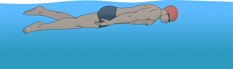 2. Modified streamlined kicking - If you are someone who predominantly kicks from the knee, a modified streamlined kick drill can be of real benefit in helping to reduce this tendency (see figure 4). Rather than having your arms streamlined in front of you, try keeping your arms by your sides and pressing your thumbs into the sides of your glutes (buttock muscles). If your glutes feel like they are working as you kick then you are doing it right! If the muscle feels soft, then your knees are bending excessively and doing too much work. Try it standing up first, kicking one leg to see how it feels. This physical feedback can make a big difference to your technique. It can also aid keeping your ankles plantar-flexed.