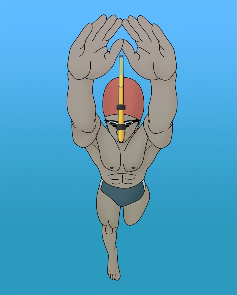 1. Streamlined kicking - A good kicking drill is ‘streamlined kicking’ on your front (see figure 3). Very rarely do I use a kickboard for practise as it is detrimental to body position and there are no real proven benefits to using them. Focus on bracing your core and keeping your spine long, and if you can bring your arms together in front of you then do. Squeeze your ears between your biceps (dependent on shoulder mobility). Kick along, and when you need to breathe, push your chin forwards, then return to looking down. You can also do this on your back and then breathing isn’t a worry.