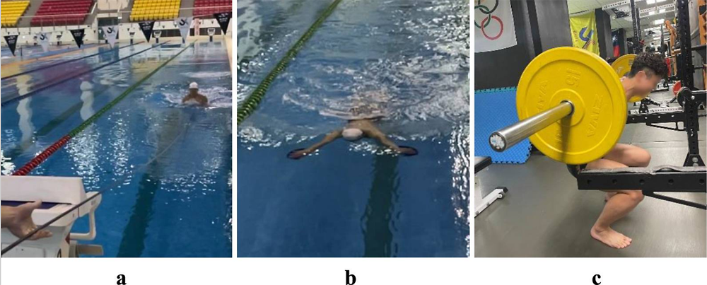 On the first trial, all participants performed the conventional 1,400m warm-up swimming test, but to ensure no systematic bias crept in, they completed the remaining warm-up swimming protocols according to a counterbalanced design: the first participant in each group followed the order tubing, paddle, and squat; the second participant followed the order paddle, squat, and tubing; the third participant used the sequence squat, tubing, and paddles and so on. During the 50m breaststroke performance test, video analysis was used to evaluate and compare stroke performance, stroke length, stroke frequency, and the acceleration of the hands, pelvis, and feet across the different warm-up methods.