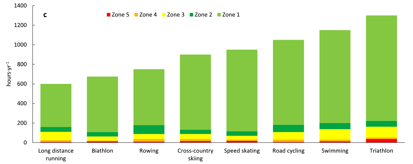 The majority of the training was performed at low intensity for high volumes. The researchers found that 85-95% of the training was considered aerobic in nature. And most of this training (80-90%) was considered low-intensity endurance training (see figure 1). By far, most training performance by endurance athletes is performed at relatively low effort levels and speed. While it can be tempting to push the intensity, it appears to be the accumulation of low-intensity work that is so critical.