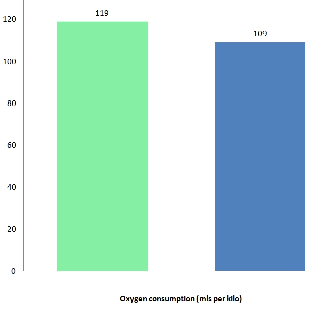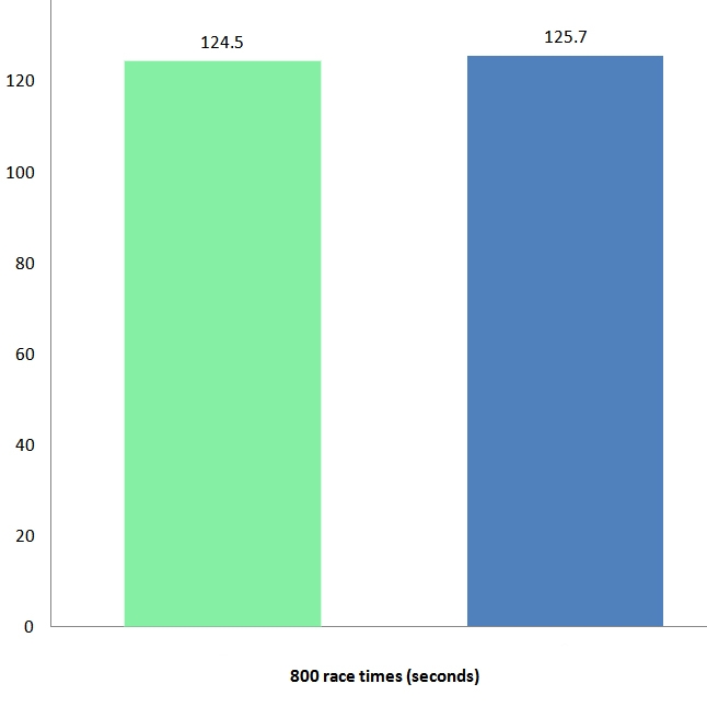 The most striking finding was that when the high-intensity warm up was performed, the 800-metre time trial performance was significantly faster (124.5 seconds vs. 125.7 seconds for high and standard intensities respectively – see figures 1 & 2). There were also differences in oxygen consumption after the two different warm ups; when the runners performed the high-intensity warm up, they consumed a total of 119mls of oxygen per kilo of bodyweight with a peak consumption rate of 4.21 litres per minute. In the standard warm up however, the figures were 109mls/kg and a peak of just 3.91 litres per minute. The likely explanation for these results is that because the runners’ muscles were better ‘primed’ with blood (and oxygen) flow after a high-intensity warm up, they derived a greater proportion of their energy in the race from aerobic metabolism, which in turn meant a reduced reliance on the lactate system for energy and a subsequent accumulation of fatiguing lactate.
