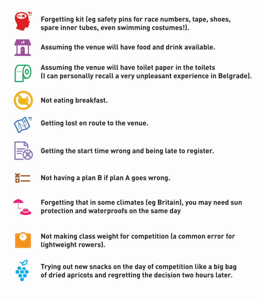 Some of these are learnt by harsh experience. However, when you look at these errors, you can see that most are easy to deal with and can easily be avoided with proper preparation. Some things we learn through happenstance. One thing I learnt recently is that having a credit card is a valuable asset if you are competing abroad. A cyclist was flying to Madeira to compete, and got diverted to Lisbon where they were promptly told to get off the plane. He then had to try and find another flight and accommodation. Luckily he had put his new credit card in his wallet and was able to pay up front with that. If he had just taken his debit card, he would have been left with a big overdraft. This is something that I now mention to other athletes. Luckily these types of misfortunes are rare, and most errors can be eliminated through the use of checklists (see panel 4).