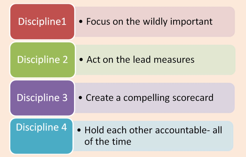 First you establish your WIG then identify your lead measures and act on them. Create a compelling scorecard and ensure that your actions are leading to progress (accountability).