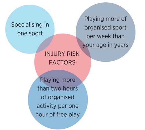 The problem is that formalising training too early (eg 6-mile runs with mum or dad) without incorporating elements of ‘playing’ can increase the chance of injury for your child. A study looking at 1206 teenage sports participants found that there were three big risk factors for getting injuredBr J Sports Med 48 p611 (2014): specialising in one sport, indulging in too much organised activity and playing too much sport too soon (see figure 3).