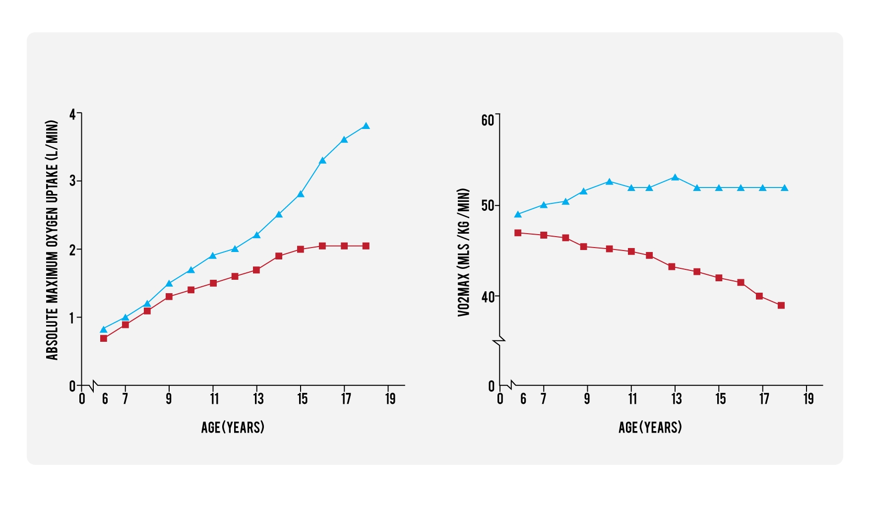 Blue triangles = boys; red squares = girls. Note how absolute maximal oxygen consumption (left) rises with age, but VO2max (ie maximum oxygen uptake per kilo of bodyweight) can actually decrease as children increase their body mass as a result of growth