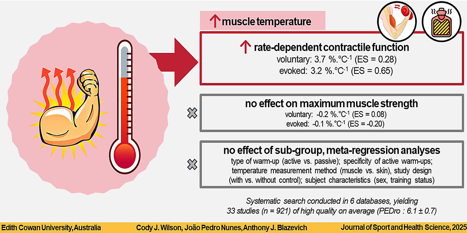 · Increasing muscle temperature, through active or passive means, moderately improves dynamic, fast-velocity force production and rate of force development (contraction speed) but not maximal force capacity in both voluntary and electrically evoked contractions.